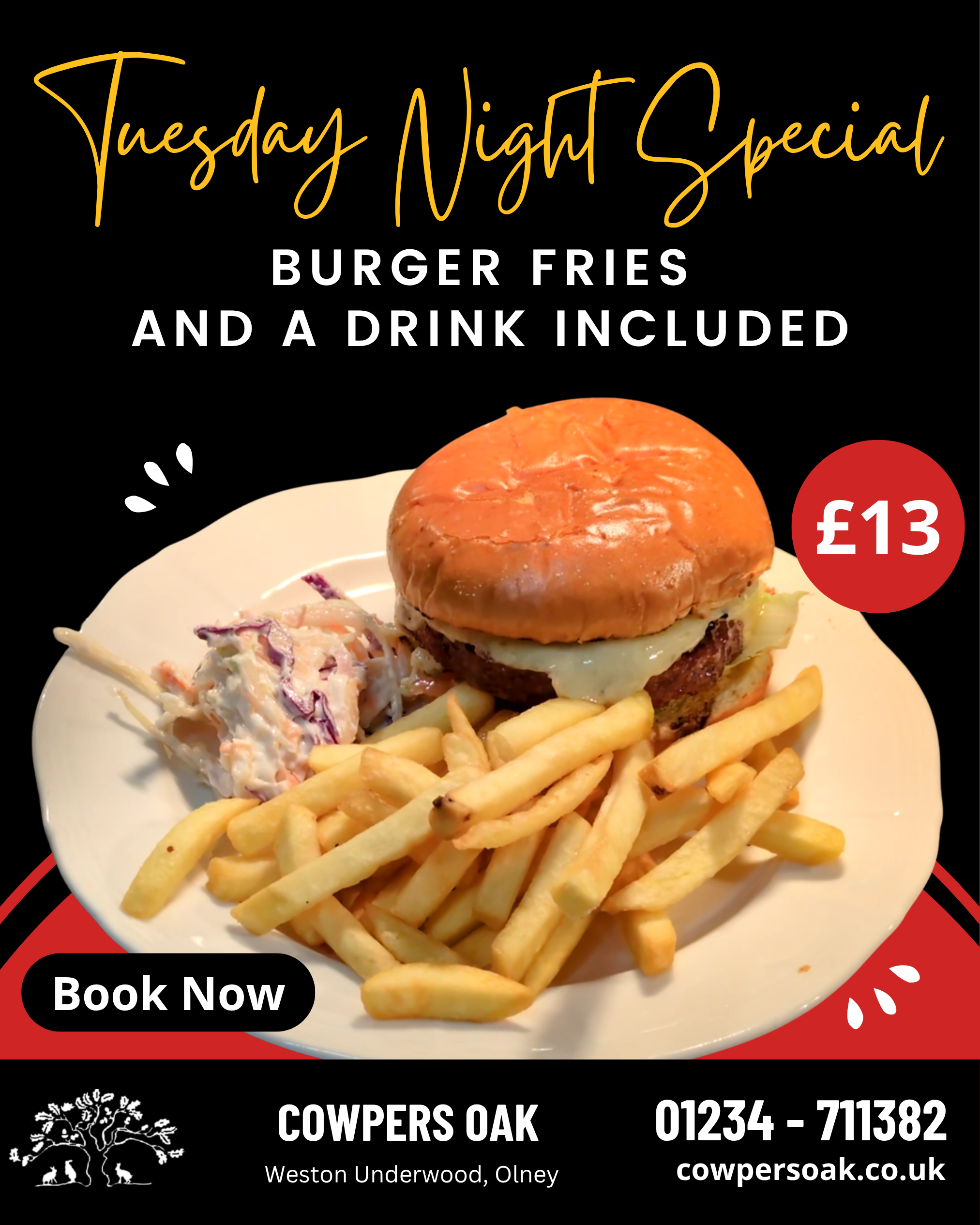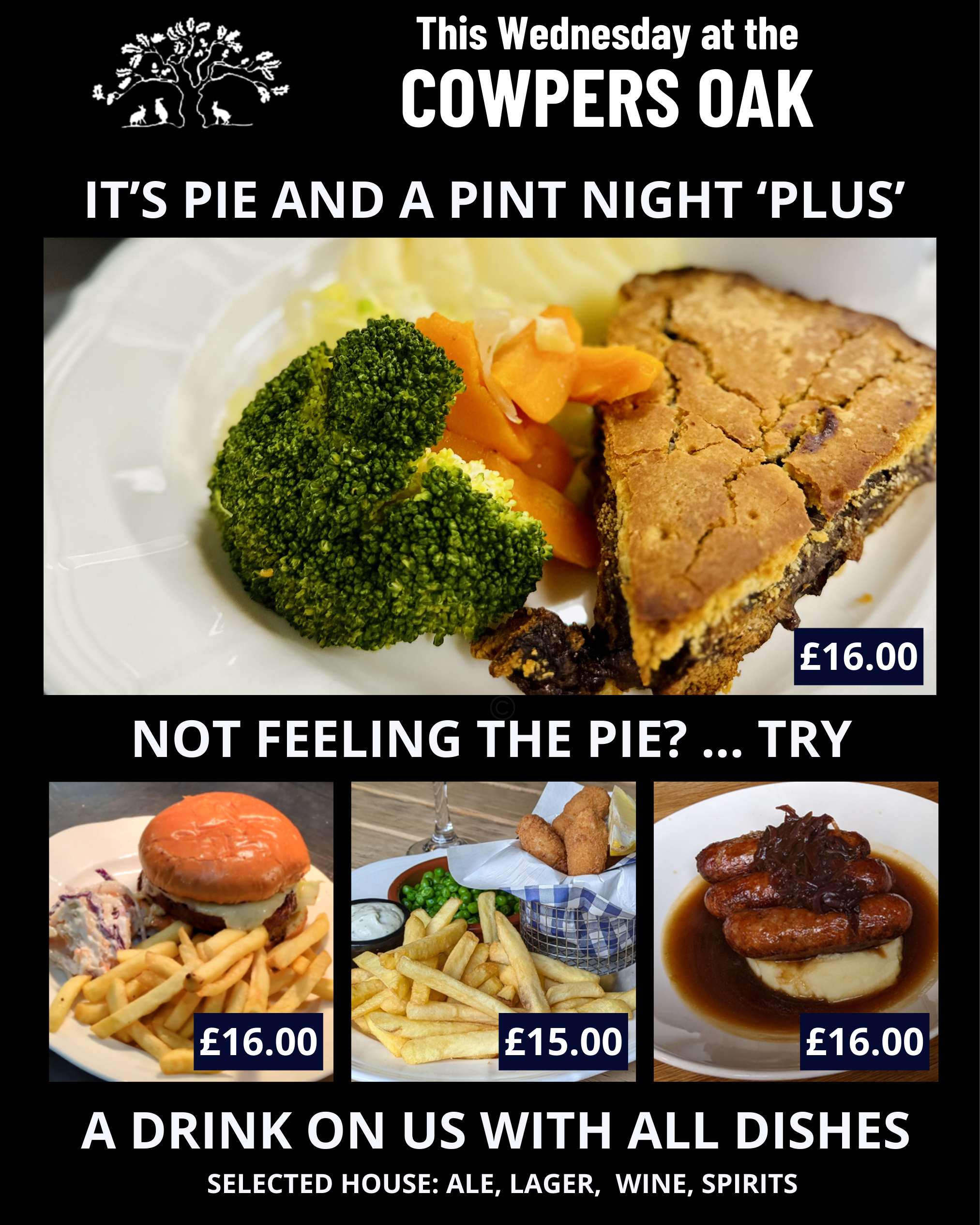 The Cowpers Oak is a lively village pub with plenty of specials though out the week. Each day is different and you can click through our offers & events to see what takes your fancy.